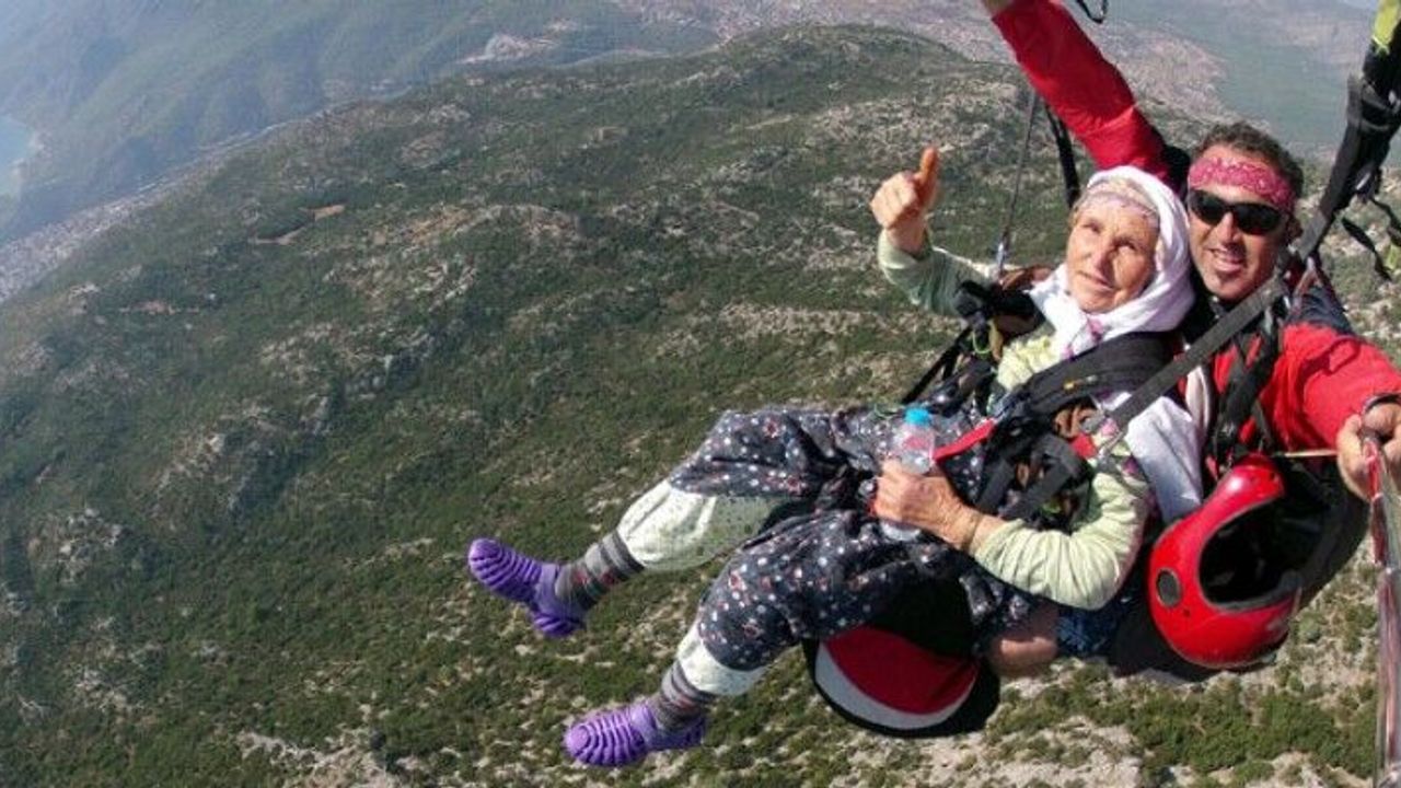 MUĞLA'nın Fethiye İlçesi'nde yöresel kıyafetiyle yamaç paraşütü yapan 87 yaşındaki Halime Akcan'ın gökyüzünde çekilen görüntüleri, sosyal medyada yarım milyon kişi tarafından izlendi.
