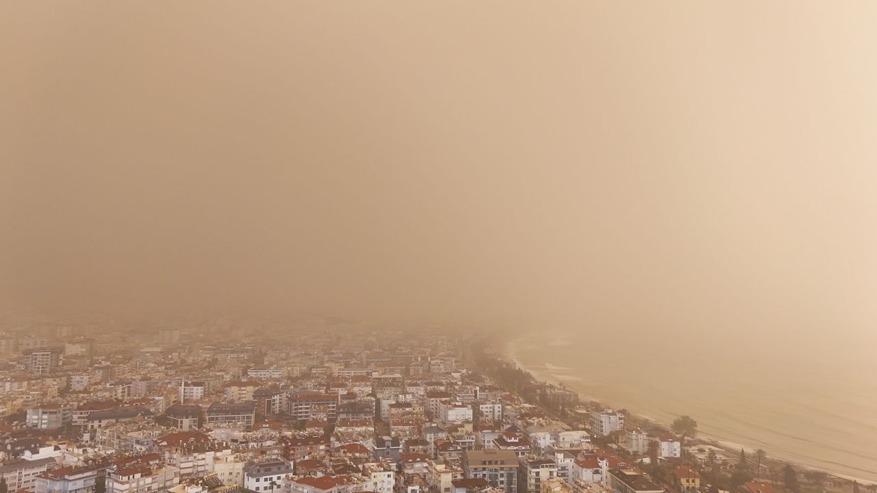 Dün Meteoroloji Genel Müdürlüğü (MGM), Ege ve Batı Akdeniz kıyıları için toz taşınımı uyarısın ardından Antalya'da toz taşınımı etkili oldu. Alanya'da sabah saatlerinde yağışla birleşen toz bulutları ilçe genelinde araçların ve açık alanların üzerini kahverengi çamur tabakasıyla kapladı. Yer yer oluşan su birikintilerinin çamur görünümünde olduğu gözlemlenirken, öğle saatlerinde toz taşınımı ektisini kaybetti. Sahra'dan gelen toz bulutunun Alanya semalarındaki etkisi drone ile havadan görüntülendi. Görüntülerde, ilçe üzerinde yoğun bir sis tabakasını andıran toz bulutu dikkat çekti.